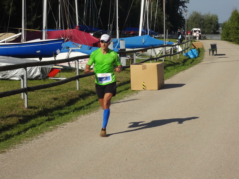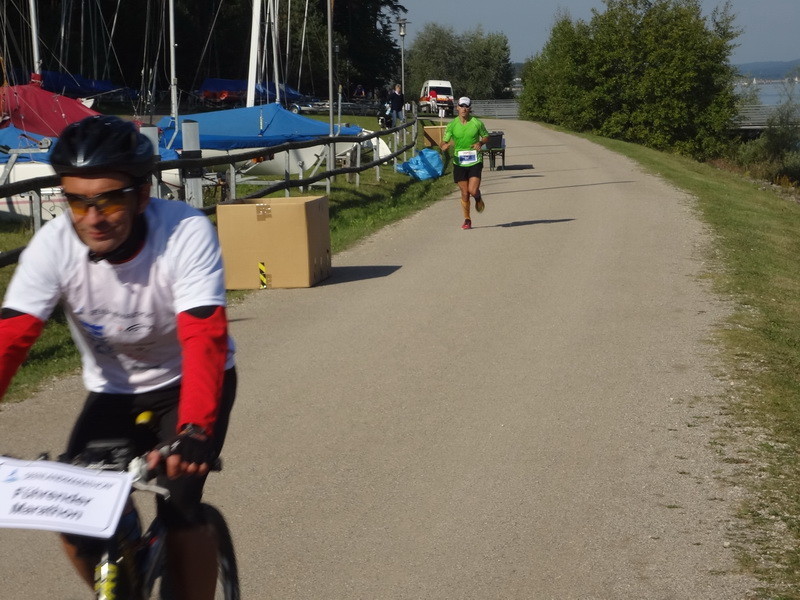 Nachdem wir zum zweiten Mal den 1,7 km langen Hauptdamm hinter uns gebracht haben, ist die 3:45er Gruppe schon wieder etwas näher, aber so langsam strengt das Zulaufen der Lücke ganz schön an. Wir laufen einen Kilometerschnitt von 5:00 oder knapp darunter. Kurz hinter dem Damm taucht wieder Andreas Mann Dieter auf dem Fahrrad auf und fragt, wie’s uns geht. Andrea meint: „ich bin platt“ und lässt sich ein wenig zurück fallen. Ich glaube fast, das war der Moment, wo sie aufgehört hat, an die 3:45 zu glauben. Ich renne weiter und schaffe es ein vorletztes Mal, die Lücke zuzulaufen. An der nächsten Versorgungsstelle will ich mir einen nassen Schwamm greifen, bekomme ihn aber nicht zu fassen und muss 5 Meter zurück laufen. Dabei sehe ich, dass Andrea immer noch ganz nah dran ist, also alles gut? Auf der Pendelstrecke ist sie nach der Wende auch nicht weit weg. Ich balle noch mal die Faust, um ihr Mut zuzusprechen, aber ab hier lässt sie den Kontakt abbrechen. Wir sind bei Kilometer 30 und auch ich merke schon ganz schön die Anstrengung. An der Versorgungsstelle laufe ich etwas langsamer und muss dann noch mal die Lücke zulaufen, was mir ein letztes Mal gelingt. Aber an der folgenden Steigung bei Kilometer 36 ist auch für mich Schluss mit lustig. Eine kleine Gehpause und die Gruppe ist über alle Berge. Andrea ist auch nicht zu sehen. Auf den folgenden Kilometern habe ich ordentlich zu kämpfen. Da ich keine Lust habe, mich allzu sehr zu quälen, lege ich jetzt immer wieder mal eine Gehpause ein und erwarte jedes Mal, dass Andrea mich einholt. Aber ihr scheint es auch nicht gut zu gehen, denn sie kommt nicht ran. Kilometer 39 erreiche ich bei 3:30. Wenn ich jetzt einen 5-Minuten-Schnitt laufen würde, würde ich die 3:45 fast noch schaffen. Aber keine Chance, auch deshalb nicht, weil es bei Kilometer 41, wo es vom See Richtung Pleinfeld zurückgeht, erst noch mal eine ordentliche Steigung zu bewältigen gibt. Aber dann geht es bergab in Richtung Ziel.