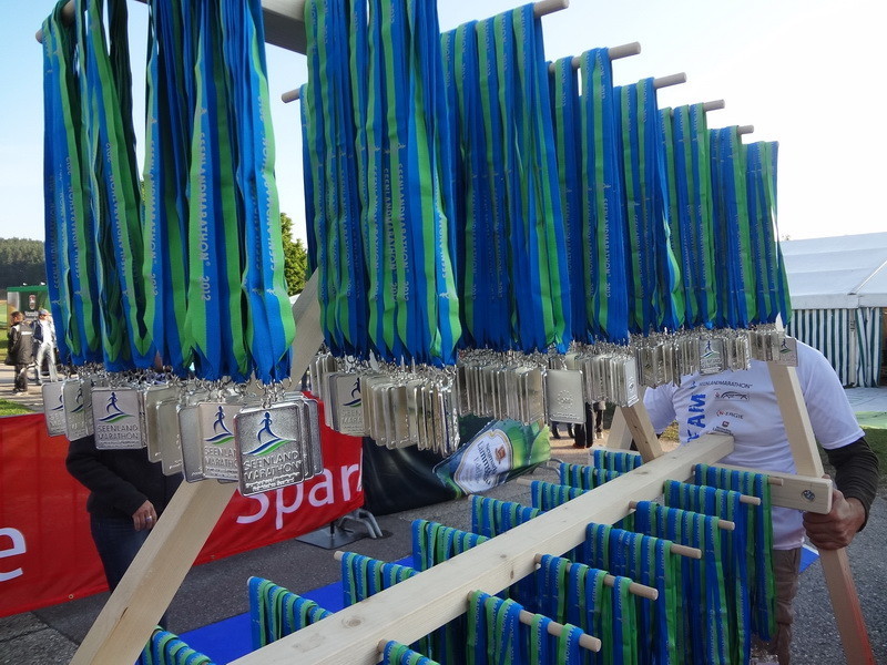 Der Sonntag verspricht ein sehr schöner Tag zu werden, kühl, aber mit viel Sonnenschein, also wieder mal optimale Bedingungen. Nachdem Kerstin und ich uns die Trophäen für die besten Läufer angeschaut haben, treffe ich meinen Kollegen und Namensvetter Thomas.