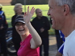 Kerstin ist inzwischen zum Damm hochgelaufen und empfängt dort die ersten Läufer. Bodo liegt vor der ersten Frau. Respekt!