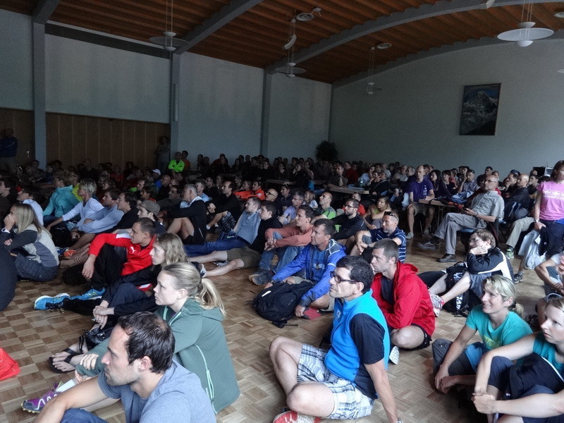 Das Event ist straff durchorganisiert. Bei der Startnummernausgabe wird die umfangreiche Pflichtausrüstung kontrolliert (von der ich – außer der Trinkblase, die ich im Verlaufe des Rennens zweimal auffüllen muss – rein gar nichts benötigen werde) und zu 2 unterschiedlichen Terminen findet ein obligatorisches Briefing statt (na ja, kontrolliert wird da gar nichts, auch Kerstin darf mit und so erhellend sind die Informationen auch wieder nicht). Das Wetter verspricht sehr gut zu werden. Allerdings gibt es nachmittags eine große Gewittergefahr, wo in kurzer Zeit mit „großen Wassermassen“ zu rechnen ist. So ein Gewitter geht auch am Freitag kurz vor dem Briefing in Grindelwald nieder. Das kann ich am Lauftag aber nicht gebrauchen…
