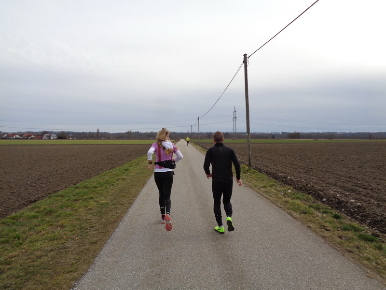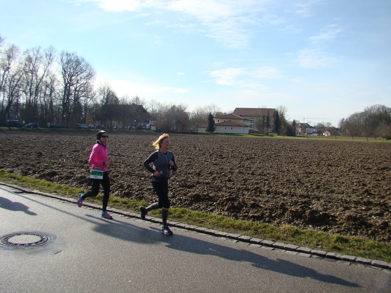 Auf der zweiten Runde halten wir weitgehend unser Tempo. Die Versorgungsstelle (auf jeder Runde gibt es eine) kommt bereits nach Kilometer 15. Ich denke mir, das werden am Schluss lange 6 Kilometer bis ins Ziel werden! Aber erst mal geht es ja auf die Halbmarathondistanz. Das Wetter ist nach wie vor wundervoll, es gibt ganz wenig Wind und wir sind weiterhin gut drauf. Durch ein kleines Waldstück laufen wir bis an den Inn ran, den wir aber nicht sehen, da er sich hinter einem Deich versteckt. Irgendwann muss ich da mal hoch und von oben ein Bild machen. Aber nicht heute. Das Knie zwickt jetzt doch schon etwas und auch Floh hat bereits leichte Knieschmerzen (obwohl er eigentlich völlig gesund ist).