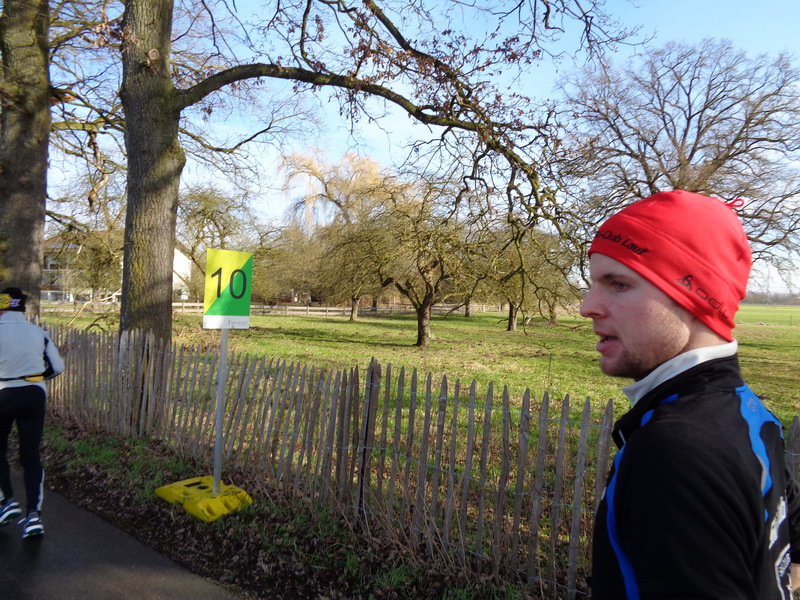 Es wird jetzt sehr einsam auf der Strecke, denn es sind nur noch die Marathonläufer da (273 Männer und 47 Frauen kommen heute ins Marathon-Ziel). Der Himmel bewölkt sich zusehends und Floh und ich sind froh, doch einigermaßen warm angezogen zu sein. Die dritte Runde beenden wir in 3:19 nach 32 km. Der km-Schnitt ist also auf 6:13 angewachsen, ist aber immer noch ziemlich gut für meine Verhältnisse. Eine Marathonzeit von 4:20 ist jetzt natürlich außerhalb unserer Reichweite, aber eine Zeit unter 4:30 ist durchaus noch drin.