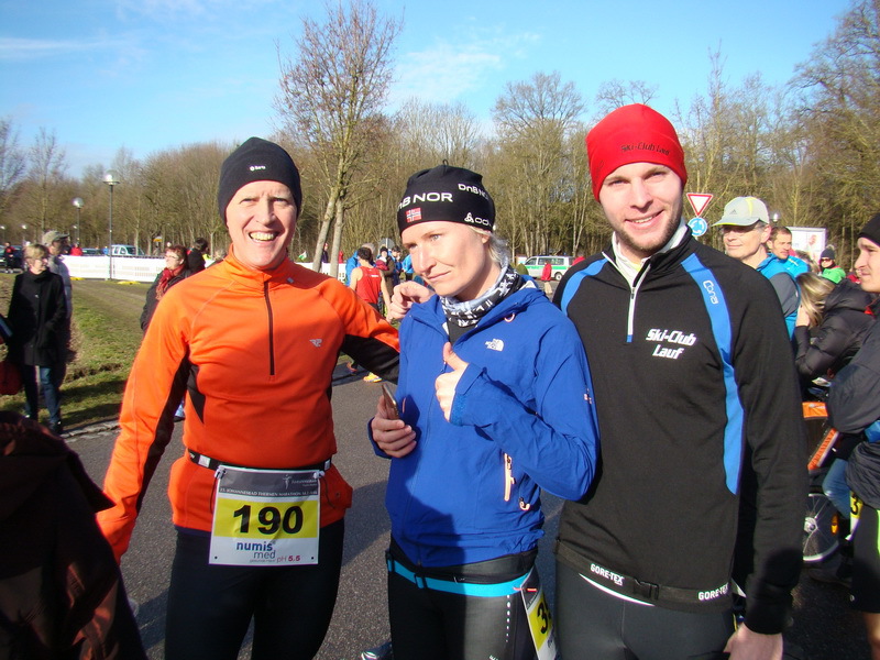 Wir haben schon einige Bekannte getroffen: Helene ist wieder mit dem österreichischem Rekordhalter Gerhard da (es wird sein 567. Marathon!), Susanne und Roland Blumensaat mit ihrer Truppe (Roland läuft wieder mit dem blinden Anton), die Uli vom DAV Röthenbach läuft den Halbmarathon, Marathon4you hat eine große Läuferschar dabei und Dietmar Mücke, der Barfußläufer aus Fürth im Pumuckl-Kostüm darf auch nicht fehlen. Überraschend treffen wir auf Elisabeth, eine Läuferin und Triathletin aus Leipzig, die wir vor 2 Jahren beim Rennsteiglauf kennengelernt haben.