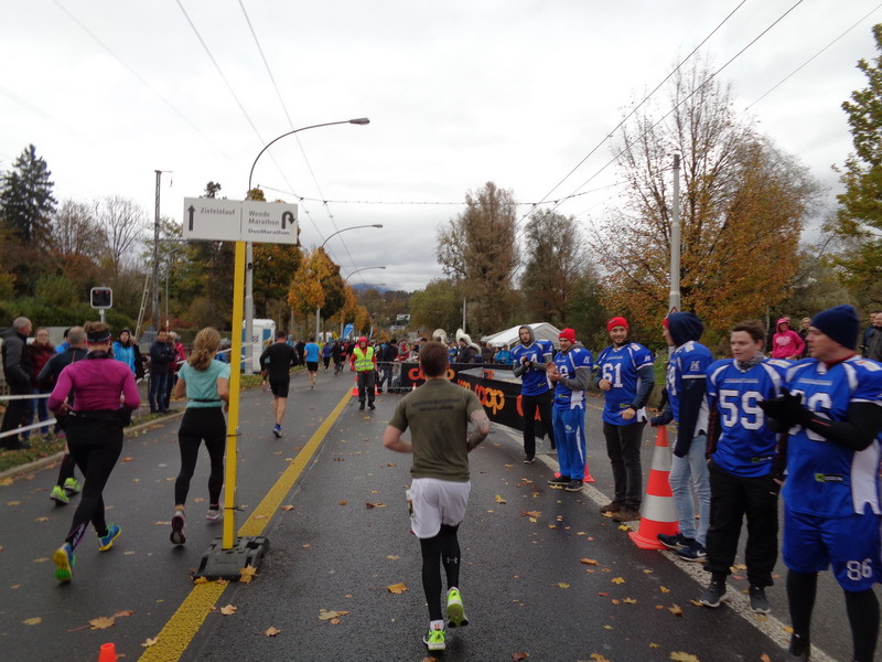 Es geht am KKL vorbei, wo die Kilometerfahne 23 steht (das ist dann auf der zweiten Runde). An fast jedem Kilometerschild stehen meist junge Frauen mit den Kilometerfahnen und feuern uns Läufer an. Auch ein toller Job, denn sie müssen ja stundenlang an der gleichen Stelle stehen bleiben.