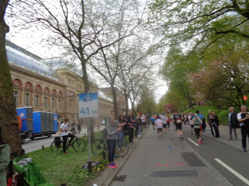 Sie ruft mir zu, dass Timo dort irgendwo sein soll. Ich verstehe sie erst nicht und denke, er läuft schräg vor mir. Am Klosterstern sehe ich ihn dann aber als Zuschauer hinter der Absperrung und halte kurz bei ihm an. Er hat große Probleme mit Arthrose und musste den Start absagen. Sehr schade! Seine Moni ist aber unterwegs und wird auch bald vorbeikommen. Als ich wieder loslaufe, meint der Zuschauer neben Timo „die Schnackerei musst Du jetzt aber wieder aufholen!“. Na gut, na gut, lauf ich halt weiter.