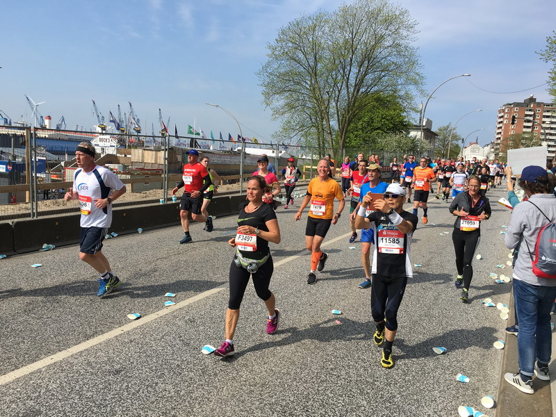 Der Blick auf den Hafen ist wie immer gigantisch, allerdings so im Gegenlicht, dass ich gar nicht erst versuche, Fotos zu machen. Es ist sehr angenehm, mit Christina zu laufen. Nicht nur, dass sie das gleiche Tempo läuft wie ich, sie macht an den Versorgungsstellen auch immer eine kleine Gehpause, um ruhig trinken zu können – genau wie ich!