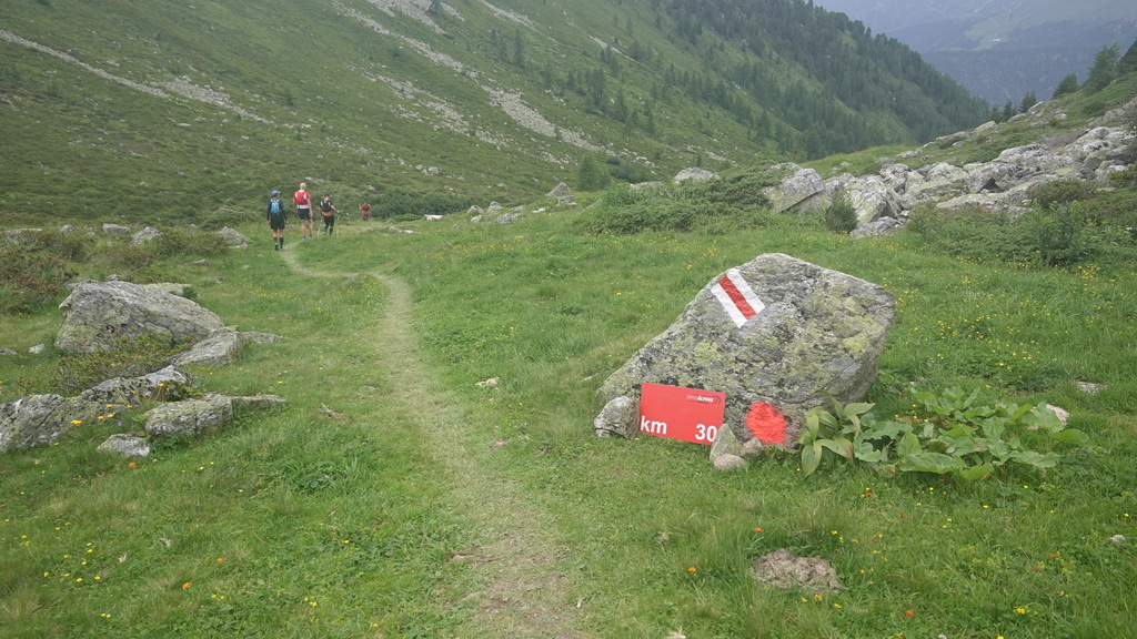 Ziemlich bald verlassen wir die Straße und laufen auf einem Wanderweg weiter. Das 65er Schild taucht auf (beim Swiss Alpine wird immer die Reststrecke angezeigt): na also, nur noch 65 km!