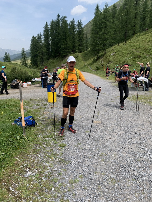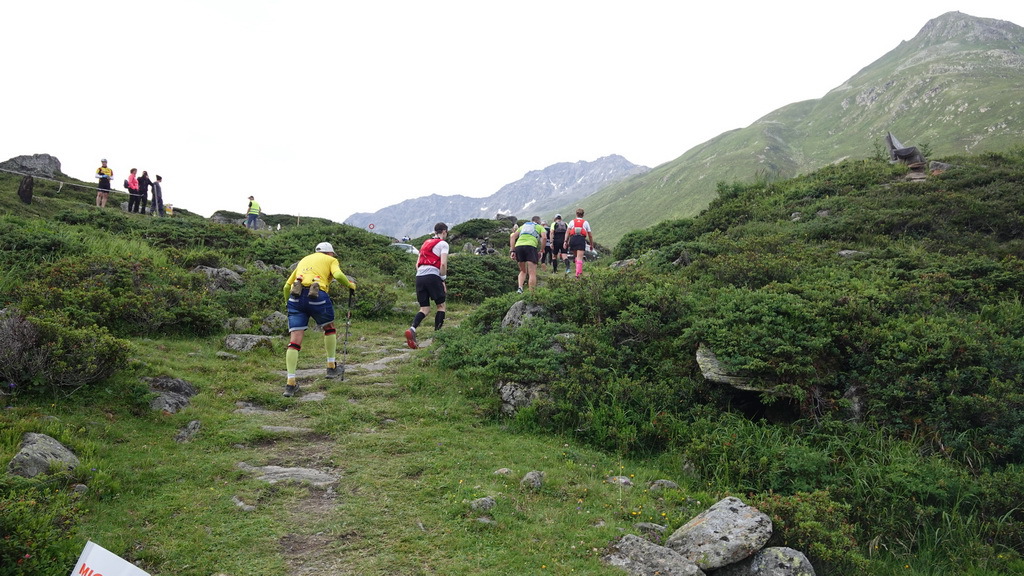 Das Gewitter kommt näher, einmal donnert es ziemlich heftig und es fängt leicht zu regnen an. Da wir aber aus dem Landwassertal raus- und in das Sertigtal reinlaufen, verfehlt uns das Gewitter. Ich bin derweil am Verzweifeln: es geht ununterbrochen leicht bergauf und normalerweise könnte ich das problemlos laufen, aber es geht einfach nichts mehr und ich kann nur noch daran denken, wie lange das alles noch dauern wird, wenn ich das alles gehen muss. Urs überholt mich. Er geht zwar auch nur noch, aber das in einem Affentempo. Helfried, ein Mitstreiter aus Berlin und schon 70 Jahre alt, versucht mich aufzubauen und spricht mir Mut zu. Vielen Dank dafür. An der Bergstation der Rinerhornbahn ist wieder eine Versorgungsstelle und danach geht es immer noch bergauf! Es ist zum verrückt werden! Von Monstein bis Äbirügg sind es 9 km mit nur 490 Höhenmetern, aber für diese Strecke brauche ich gefühlte Ewigkeiten.