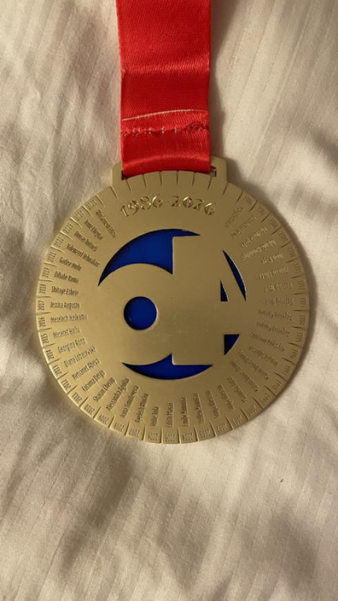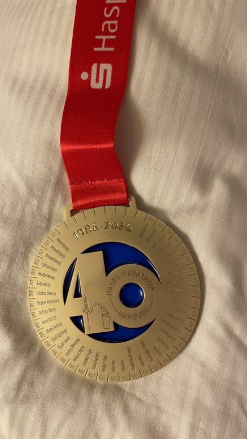 Damit wäre mein 15. Hamburg-Marathon geschafft. Zum 40. Jubiläum gibt es eine große und schwere Medaille, auf der alle Sieger (und auf der Rückseite alle Siegerinnen) der bisherigen 39 Marathons eingraviert sind. Eine schöne Idee.