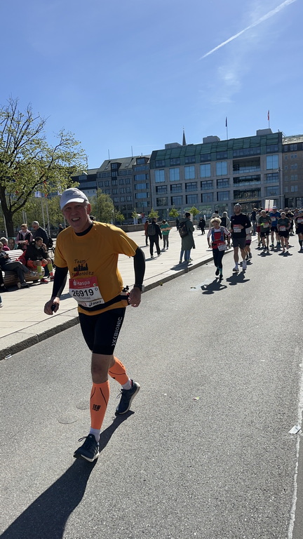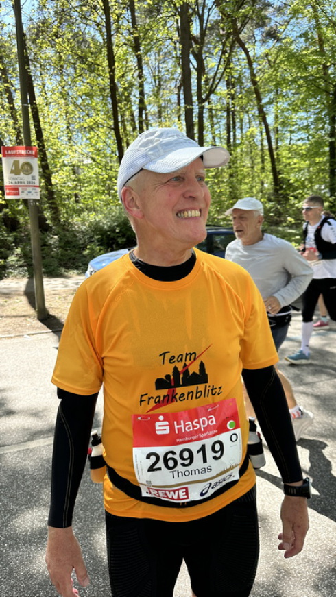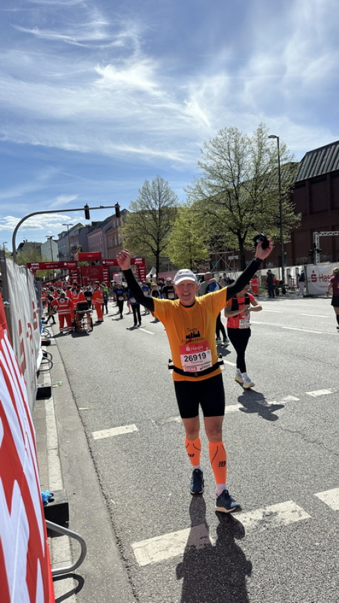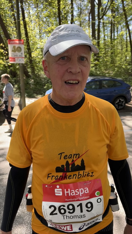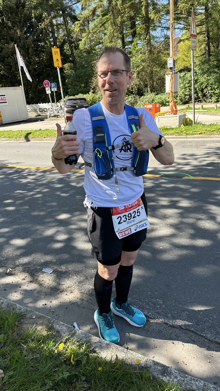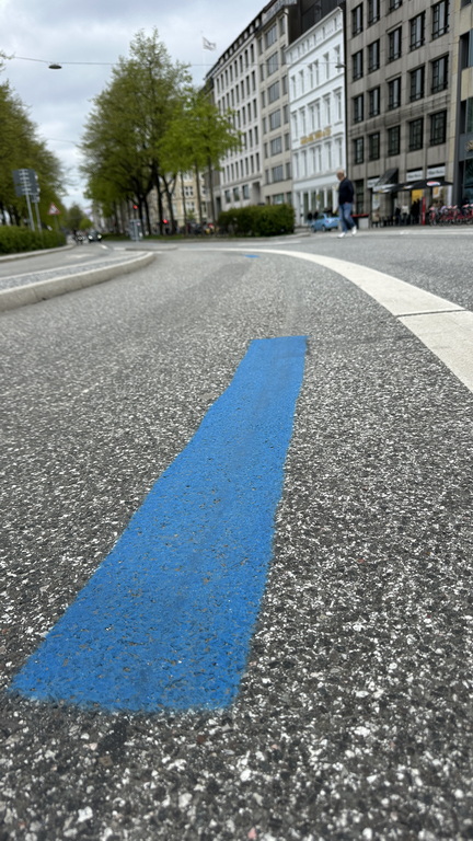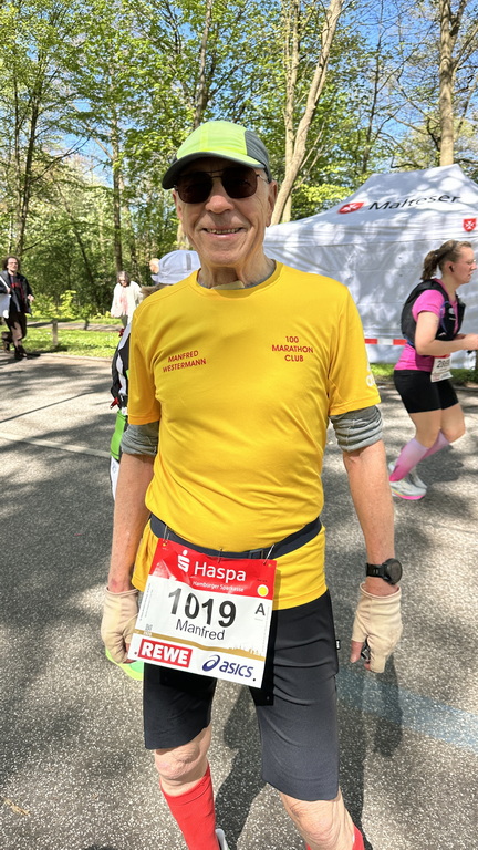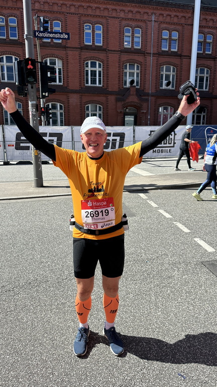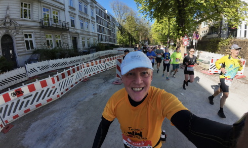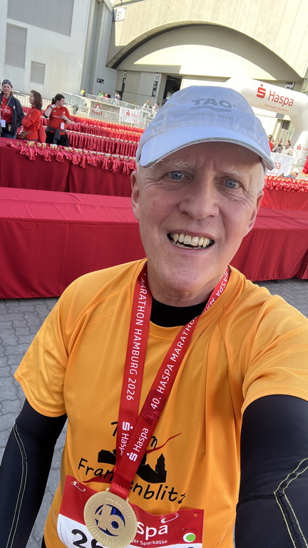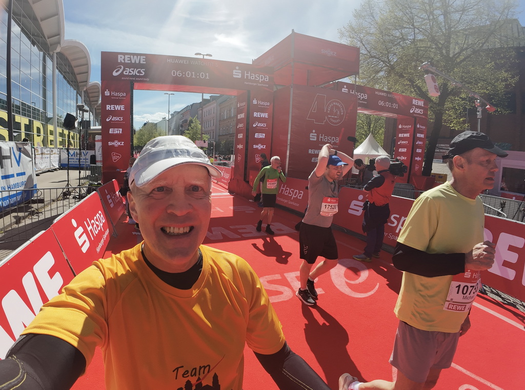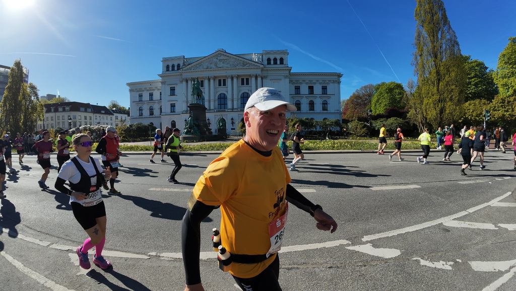Es ist aber der 40. Hamburg-Marathon und mein 15. (ab 15 gehört man zum „Blue-Line-Club“) und nachdem ich schon beim 20. und 30. dabei war, musste ich das einfach schaffen. In Hamburg wurde die blaue Linie erfunden, mit der die optimale Strecke bei einem Marathonlauf auf der Straße markiert wird und die man mittlerweile bei vielen großen Marathons sieht.