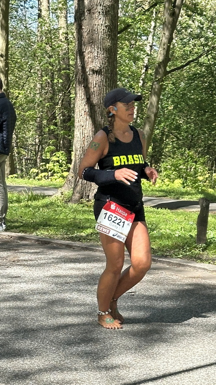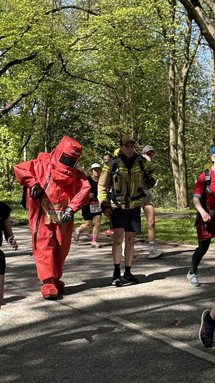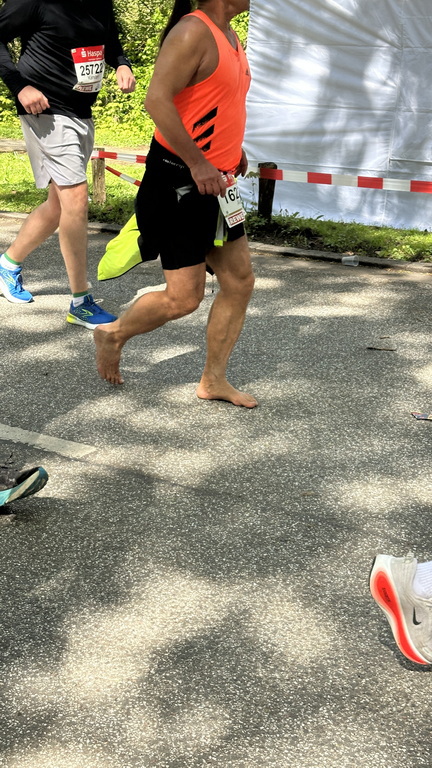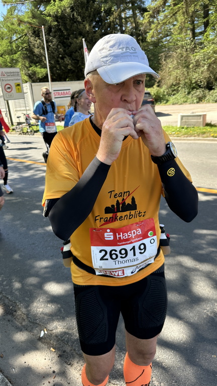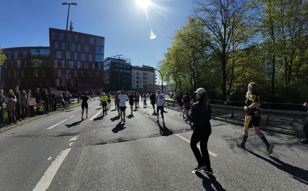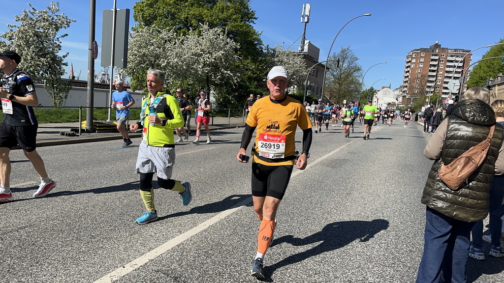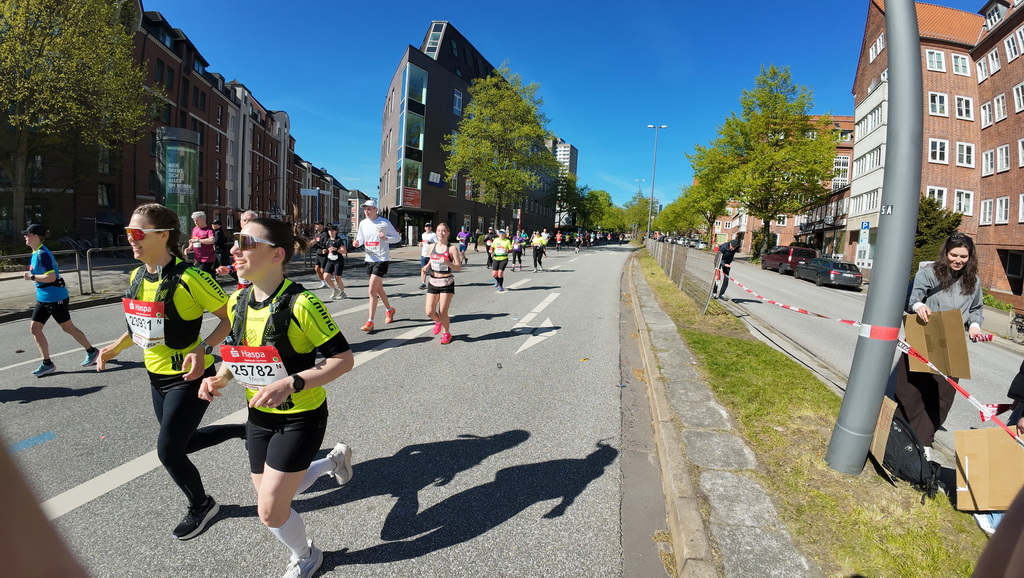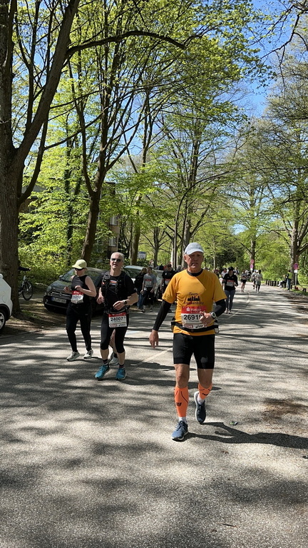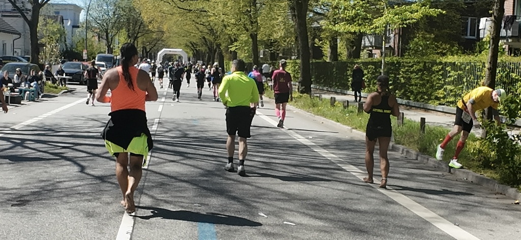 Kerstin und Cathrin warten bei Kilometer 30 in Ohlsdorf, das ist der nördlichste Punkt der Strecke und ab da geht es wieder zurück bis ins Ziel. Wieder sind Feuerwehrmänner in voller Montur dabei, der Wasserträger Hummel Hummel natürlich wie jedes Jahr auch (er ist ein Däne!), mit Manfred ein Mitglied des 100-Marathon-Clubs, den ich später auch noch treffe und der gar nicht mehr gut zu Fuß ist (er wird es aber noch in 6:08:27 schaffen) und zwei Barfußläufer aus Brasilien, die ich später auch noch überholen werde (sie kommen in 5:41:53 ins Ziel).