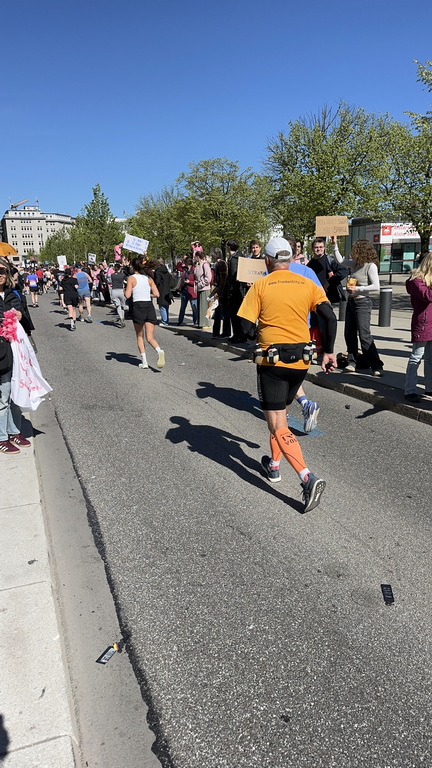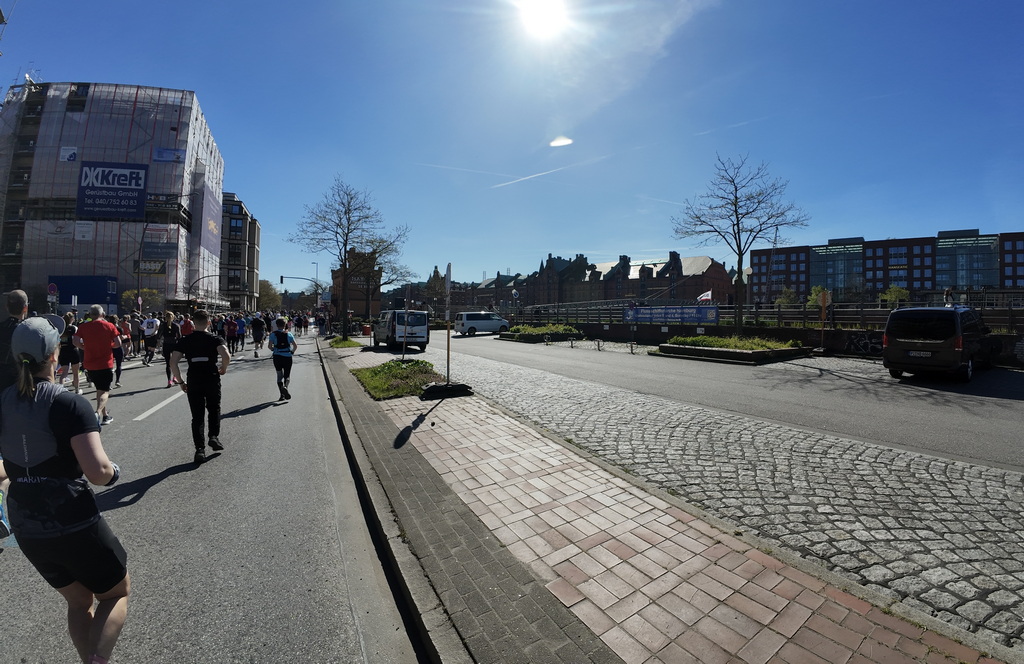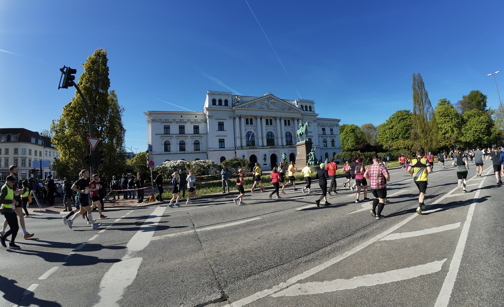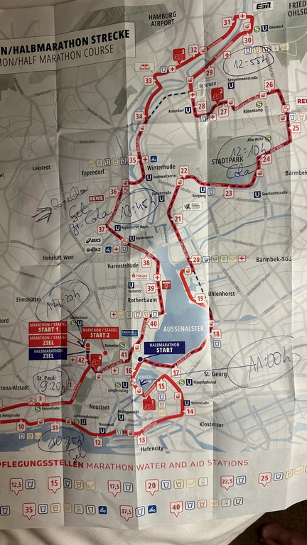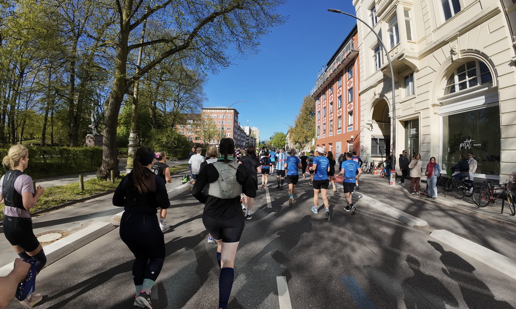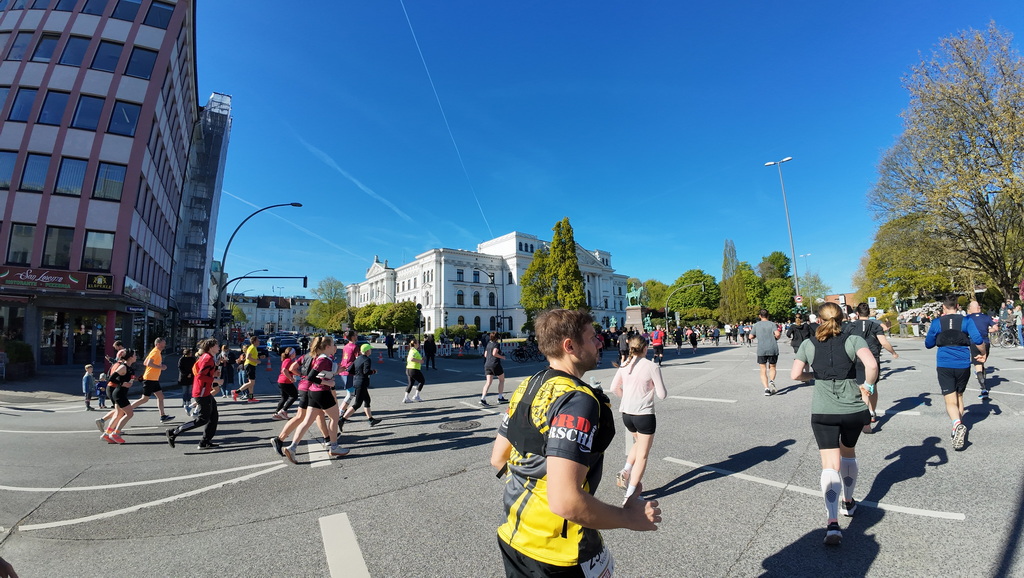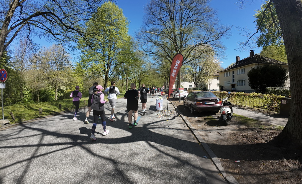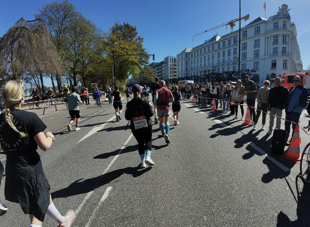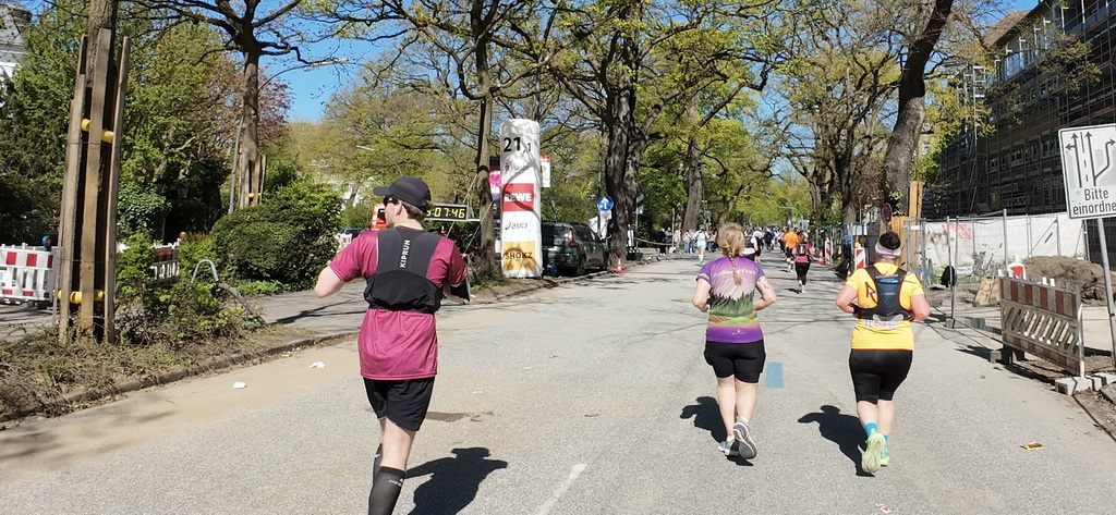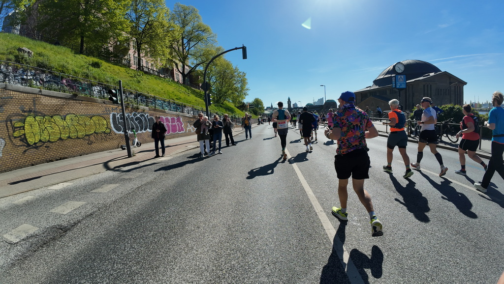 Wir passieren das Hotel, in dem Udo Lindenberg wohnt (keine schlechte Adresse!) und laufen ein paar Kilometer an der Außenalster entlang. An den Versorgungsstellen liegt immer mehr Müll herum. Nach 2:35 erreiche ich endlich den Halbmarathonpunkt. Die Kilometerabschnitte werden nach und nach immer länger und eigentlich schmerzen die Wade und der hintere Oberschenkel ziemlich, aber immerhin schaffe ich es, einen Krampf zu verhindern. Allerdings merke ich schon, dass das heute ein ganz schwerer Kampf wird.