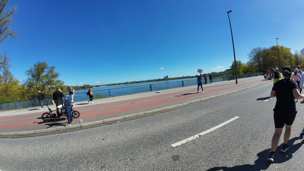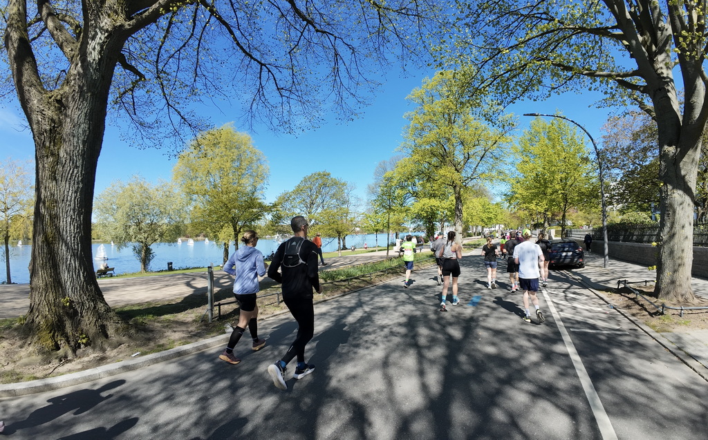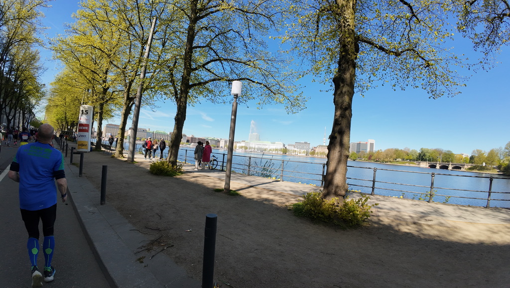 Diesmal hat Kerstin es geschafft, auch an den Jungfernstieg zu kommen (ist zeitlich sonst immer etwas knapp). Sie sieht neben einem Feuerwehrmann, der in voller Montur mit Atemschutzmaske läuft, auch René und kurze Zeit später mich durchlaufen. Noch geht’s uns gut! Vorbei am Niveahaus laufen wir schließlich über die Kennedybrücke an die Außenalster. Bei dem Traumwetter sind trotzdem nur ganz wenige Segelboote auf dem Wasser, denn es ist weitgehend windstill (gut für uns!). 17 km sind geschafft.
