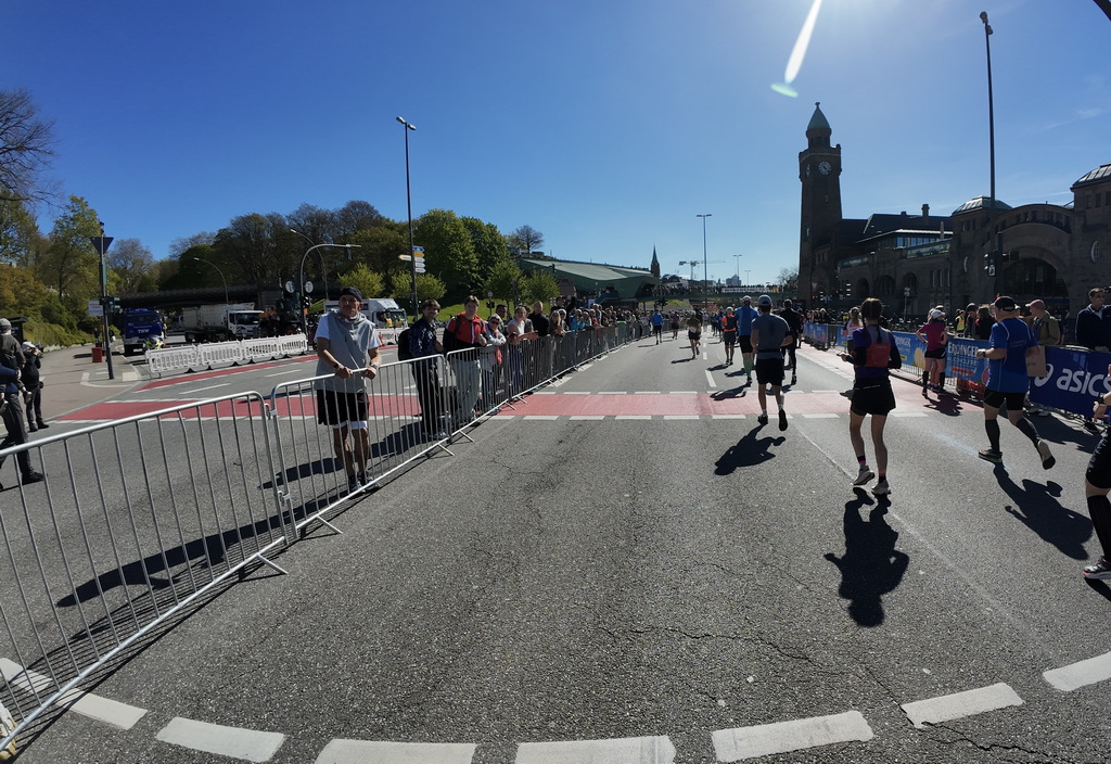 Und so kommt René am nächsten Treffpunkt bei meinem besten Fan an den Landungsbrücken ohne mich an. Ich bin aber nur wenige Minuten dahinter. 11 km sind geschafft und es geht mir noch einigermaßen gut, auch wenn bereits meine Wade etwas zwickt. Das kann ja heiter werden!
