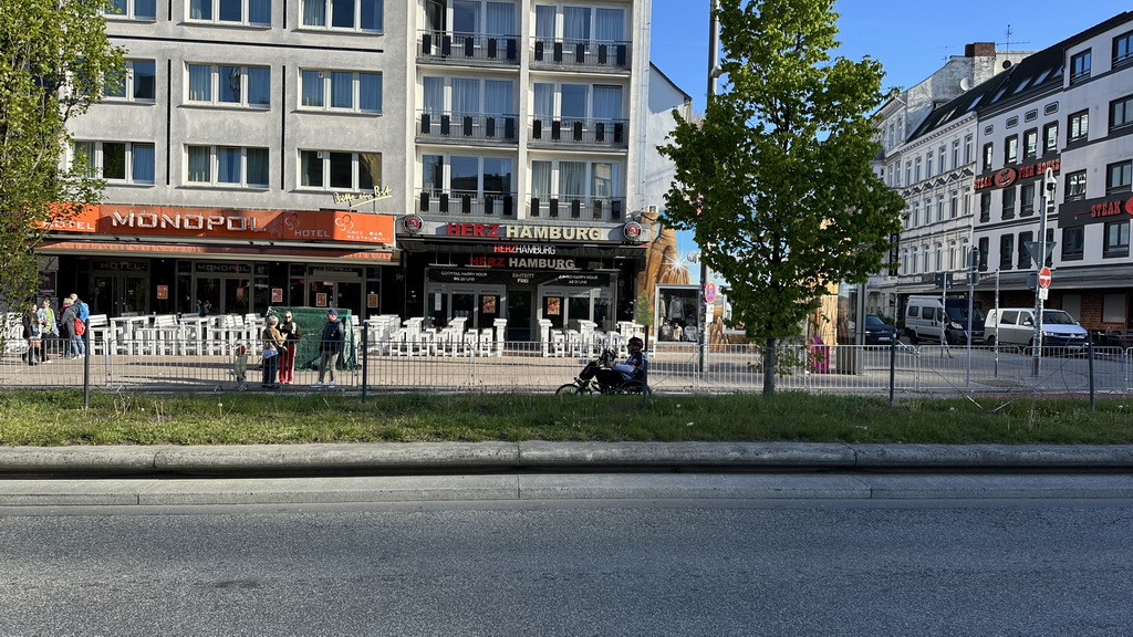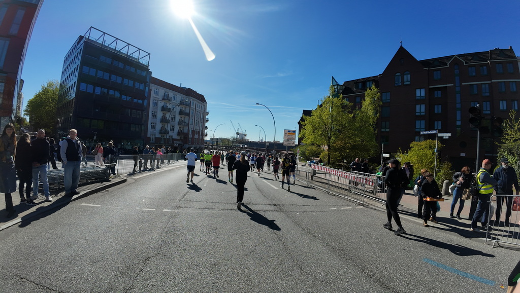 Und dann kommt endlich der Startschuss. Yvonne lässt sich rasch zurückfallen, denn sie wird den größten Teil der Strecke schnell gehen. René und ich laufen erst mal mit ca. 7 Minuten pro Kilometer los (ich hatte mir eher eine 7:20 vorgenommen, aber es geht schon noch) und passieren nach 2 km unseren ersten Treffpunkt mit Kerstin auf der Reeperbahn.