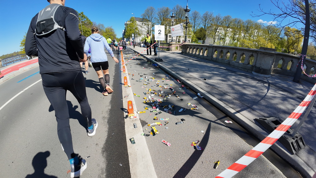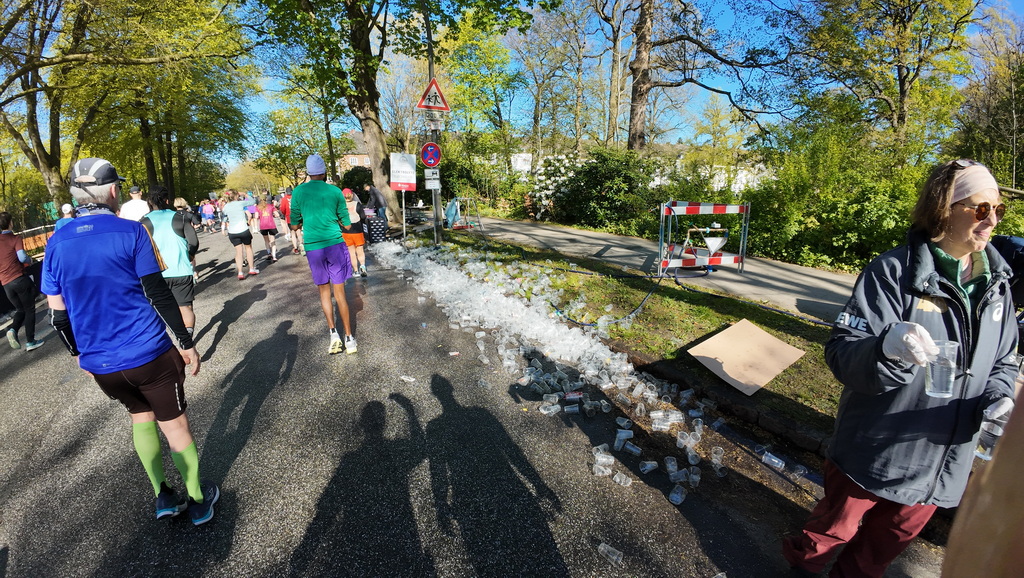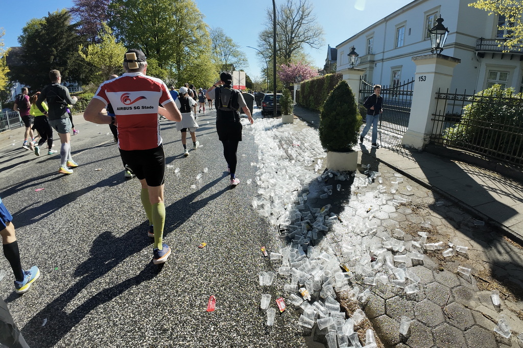 Nach knapp 4 km passieren wir das schöne schneeweiße Altonaer Rathaus und einen Kilometer später kommt schon die erste Versorgungsstelle (ab hier gibt es alle 2,5 km Wasser und alle 5 km die Komplettversorgung). Wasser wird aus Plastikbechern ausgegeben und entsprechend sieht es auf der Straße aus, denn es waren schon gaaaanz viele Läufer vor uns.