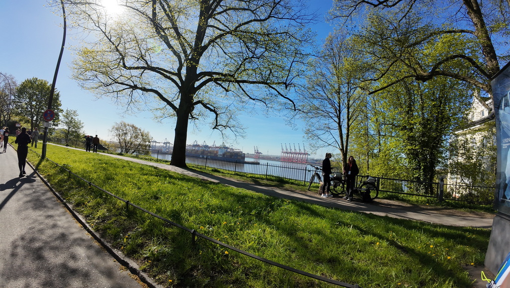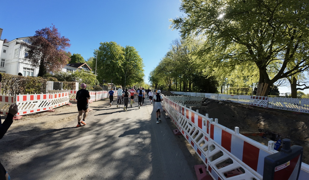 Nach Kilometer 6 geht es über die Corinthstraße an die Elbchaussee und es kommt der erste wunderbare Blick auf das Hafengebiet. Allerdings wird die Straße neu gemacht und die Elbchaussee ist diesmal eine einzige Baustelle; kilometerweit müssen wir auf Schotter laufen.