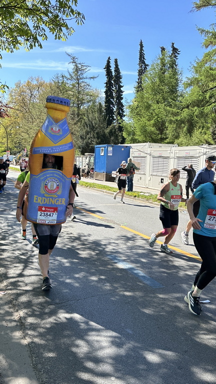 Aber es hilft nichts. Bei Kilometer 24 wartet wieder Kerstin, die mittlerweile Verstärkung von Cathrin bekommen hat. Die Erdingerflasche kommt vor uns durch, Michel ist auch da, aber diesmal auf dem Fahrrad und erst mal bekommt René seine heißersehnte Cola und ich dann mein Gel. Cathrin hat meine Cola in der Hand und als ich meine ausstrecke, um danach zu greifen, schaltet sie erst mal nicht und schüttelt mir stattdessen die Hand. Gelächter auf allen Seiten! Aber natürlich bekomme ich trotzdem meine Cola und kann weiter.