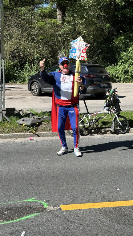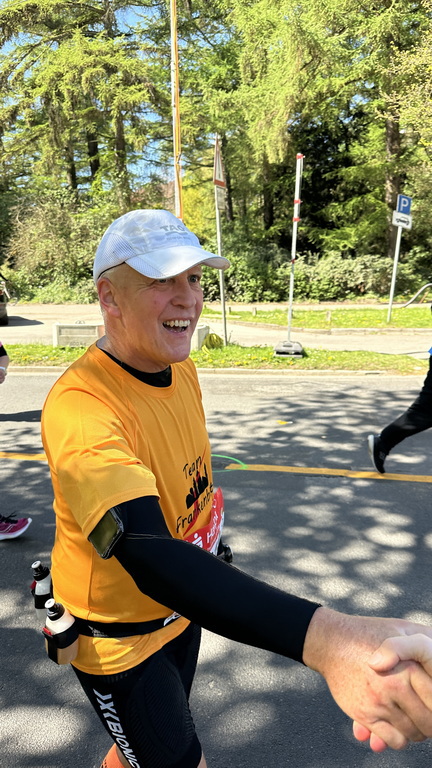 Bei Kilometer 27 ist die zweite Wechselstelle der Staffel. Da haben René und Yvonne auch schon teilgenommen. Der Marathon wird auf 4 Streckenabschnitte aufgeteilt (erst 15 km, dann 12 km, 5 km und 10 km). Meistens sind die Staffelläufer deutlich schneller unterwegs als wir, aber es gibt auch einige, die von uns überholt werden. Es sind eben nicht nur erfahrene und gut trainierte Läufer dabei.