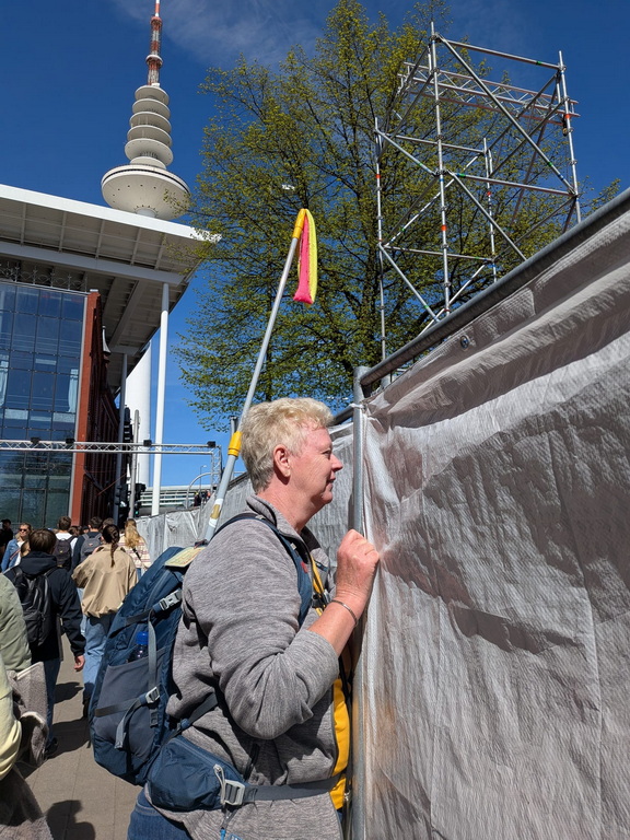 Mein Lieblingsfan und ich trennen uns schon vor dem Hotel, denn Kerstin geht an die Reeperbahn vor der Davidswache und ich muss erst mal zur Messehalle B6, um meinen Beutel abzugeben und danach an den zweiten Startbereich (diesmal wurde der Start aufgeteilt: der eine Teil der Läufer (die unter 4:30 laufen) startet wie immer auf der Karolinenstraße unter dem Fernsehturm ab 8:30 Uhr und der andere Teil (also die langsameren) auf der Straße Bei den Kirchhöfen ab 9:00 Uhr.